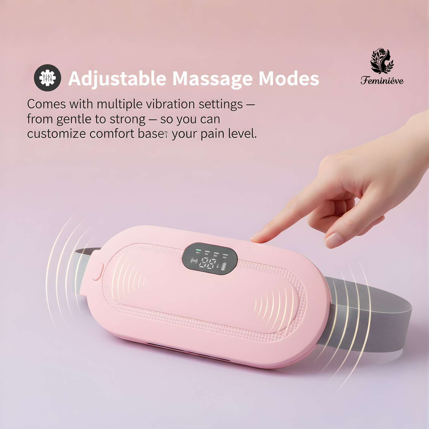 Choose the comfort level that suits your body best. With multiple massage modes, the Feminieve Relief Belt lets you control how you relax — gentle, strong, or perfectly balanced.